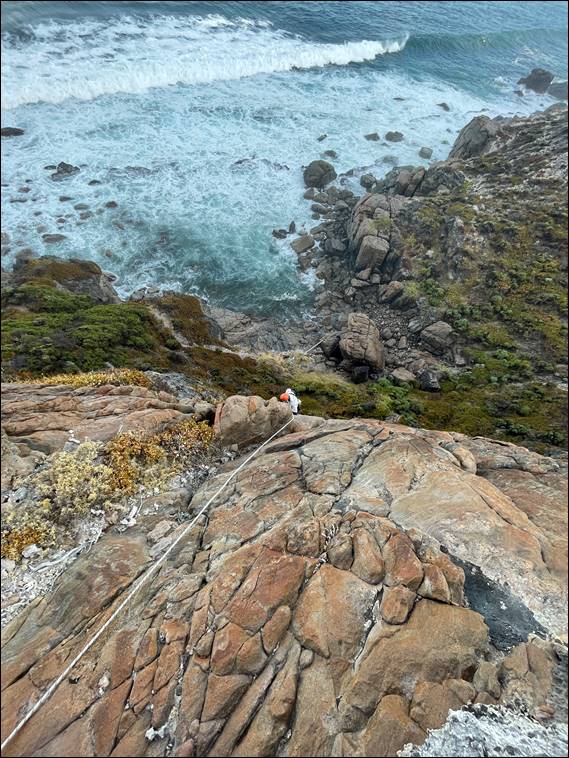 The rock also had that greasy feeling you get when the salt spray drifts landward, something we noticed was happening when we walked in. None of this stopped us and we both thoroughly enjoyed what the place had to offer. Josh even hinted he might be keen to have a lead, as long as it wasn’t anything too silly. But before he took the pointy end, I racked up three fine lines. Allowing Josh to warm up and get used to the nature of this place, while the sun crept that bit higher and begin to burn off some of the dampness:
