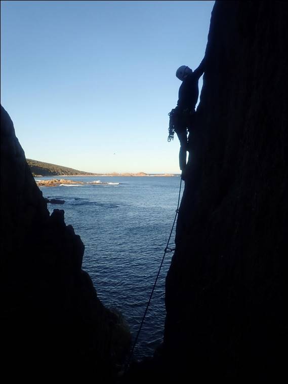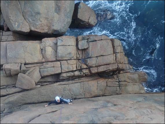 Both physically and mentally, and maybe a bit more in the latter department as the grades never get too high here. We again missed out on a colourful sunrise, but the rock was dry and ocean seemed reasonably calm hinting the chance for a snorkel was high. I started on a rarely climbed route, in part due to the thin and balancy start with not much gear. In the image above it looks like there is a good rock ledge below the climb onto which you could jump if you failed to make the moves. That is however not the case, as it slopes down to the water:
