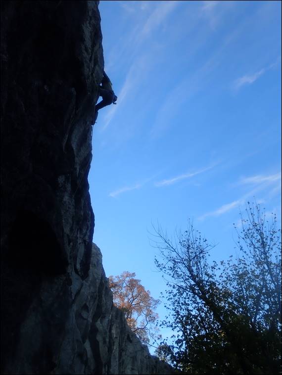 Today I rationalised waiting for the train to pass would allow a bit more time for first light to really get a hold on the sky. It was sadly not to be, our timing was good but the sky was mostly cloudless and merely became that familiar blue. Being cloudless did however assist in making it a dry, cool, and crisp morning. And after all the warm mornings this summer it felt strange for the rock to feel cold to touch. Making our fingertips become numb on the first climb, a sensation that didn’t last very long at all. Our intention had been to head to Moses Rocks for a relaxed climb: