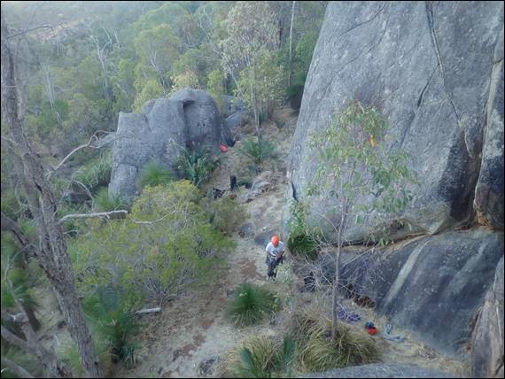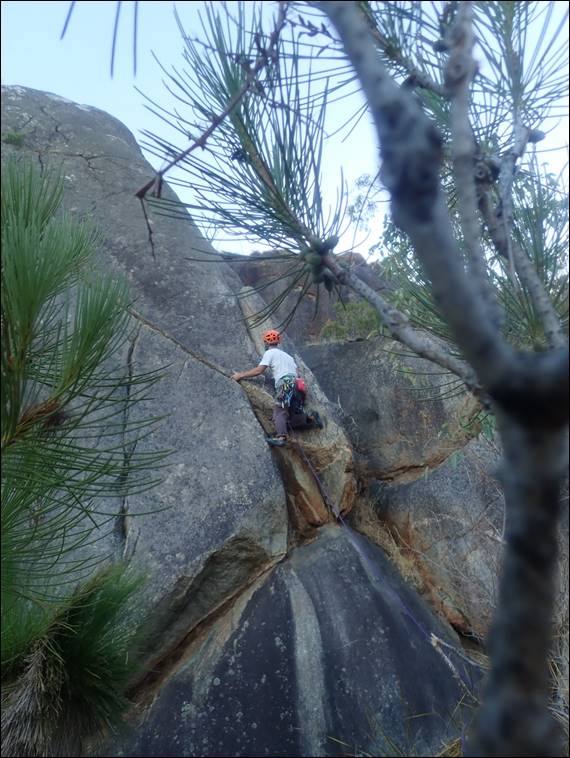 This is the only place in Western Australia I can think off where you can climb on two different types of rock. Each requiring a different climbing style. Having been here a few times over the last ten years, I was happy for Pontus to pick the routes and take the sharp end. He’s keen as mustard, so there were no complaints from his side about does arrangements. To escape the wind being funnelled along the road, we started on the natural granite outcrop of Boomer Crag. Nestled up on the side of the valley it is situated in a more sheltered location: