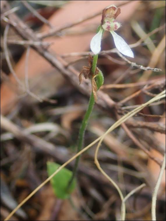 The cumulative effects of two solo sessions in one weekend took its toll, as the morning wore on. On the last lap, which is also when a light sprinkle of rain started, it felt like a repeat of my second route. I spent a disproportionate amount of time hanging on the rope, thankfully not just a thread. The soreness creeping over my body was however forgotten when I spotted a Swamp Bunny Orchid (Eriochilus helonomos) in the thin veneer of soil atop the granite. The tell-tale heart shaped leaf, along with the height, and position of the petals giving it away: