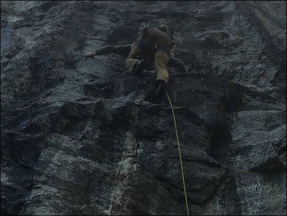 On my climb Howsie mentioned he could hear a bit of a thud when my feet made contact with the rock, whereas it is usually a relatively quiet process. Today was definitely more of a mental, than physical, game. We climbed slowly and cautiously. Maybe holding on that bit too tight, and certainly not maximising our flexibility or ability to reach as we would normally. There is a tendency to stay in a more compact position, which somehow feels safer but then makes the climbing harder. Howsie was rewarded for his perseverance when he topped out. The winds were pushing the fog and rain away, and brought over some welcome clear skies: