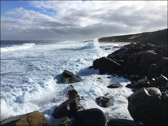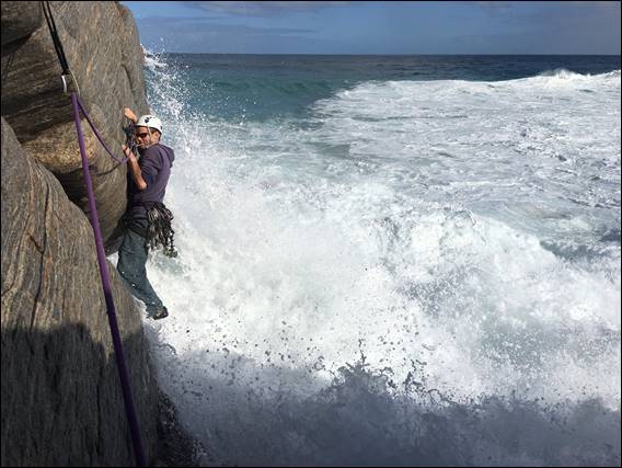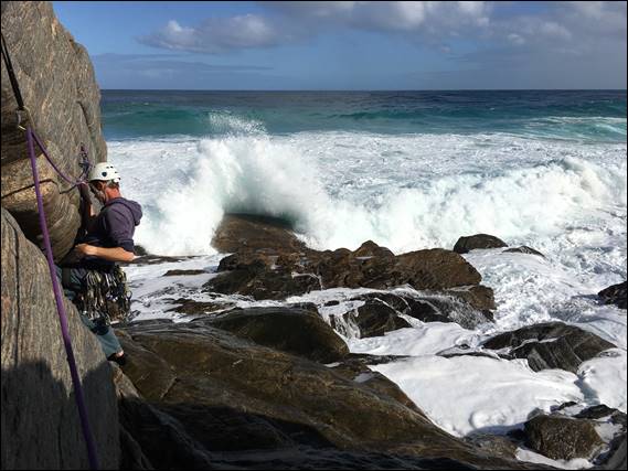 He picked Moses Rocks. Seeing I had unfinished business here, I was more than happy to come back so soon. After a couple of warm up routes I suggested he might want to jump on Nothing too Serious, a short but fun traverse that makes you feel like you are right over the ocean. There are however some big rock steps that take the energy out of the waves, and all you are left with is wash and spray. That doesn’t mean you shouldn’t be careful, and we watched for ages to check the wave patterns. Even then tying in when he went for it:
