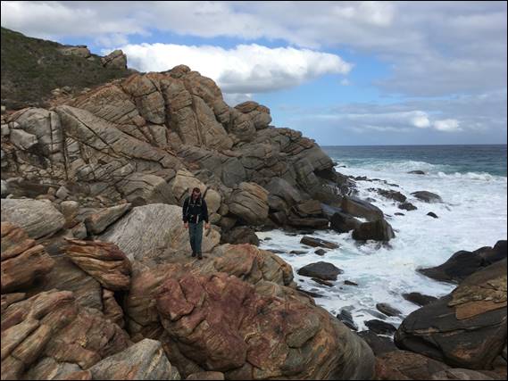 Fair to say I was a little discombobulated. But soon realised my camera and phone, both of which I had been using, were gone. With Craig secure I did a quick search, keeping a careful eye on the ocean. Somehow that one freak wave had taken the phone out of my hand, placing it on the rock where my camera had been. And taken the camera, which we assume is now lost at sea, or as I like to think swimming with the fish by itself. It took Craig a while to finish the climb, and then for me to follow: