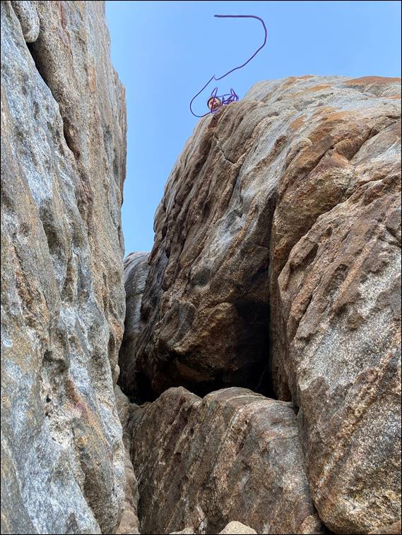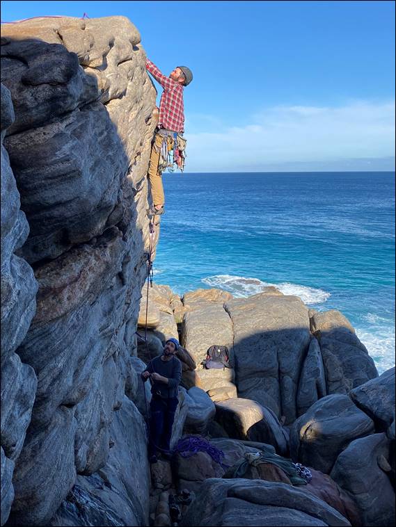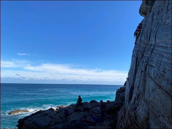 I’ve called the climb Rolling Thunder, which works in nicely with the names of the other lines on this wall. It is also reflective the climb itself. We decided on grade 16, HVS 4c/a, which was two to three grades harder than David had indicated he was keen to try on lead. This resulted in him being a little weary. His brain had also been pushed to the limit. Sadly resulting in the harder to protect routes on Hands Up Wall not looking inviting for him to try on lead. But we had to get to this wall. Firstly to show him the Zawn, which he immediately liked the look of: