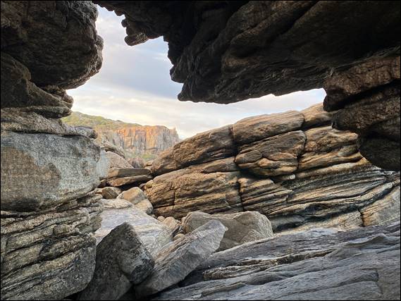 I surprised myself a bit with how much I managed to do. All good things must however come to an end. After close to an hour and a half of bouldering it was time to leave. The return trip was along coast, heading south towards the mighty Northern Blocks. Maybe next time Howsie and I get out, he’ll be more psyched for a few tougher climbs there. For now I was content to just look at the cliffs being light up by the early morning sun, as were the stairs at the left hand end that I had descended in darkness just a few hours back. With the mornings fun stuff over, on the drive home it was time to go shopping: