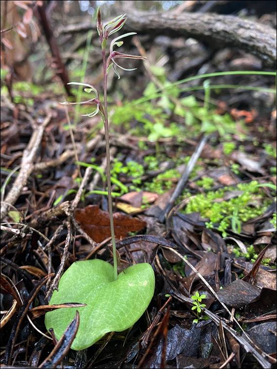 This meant the walk in was a little bit slower. Sadly the Sandhill Helmet Orchids flowers still hadn’t blossomed. Although we did spot what I stated was ‘just another’ Mosquito Orchid. However, it is a Cape Mosquito Orchid (Cyrtostylis sp. ‘Cape Naturaliste’). My orchid book indicting it was recently identified as a species, but I cannot find out when this occurred. Differing from Mosquito Orchids, by being a third of the height, having a slightly narrower labellum, and having the lateral sepals that are held slightly differently: