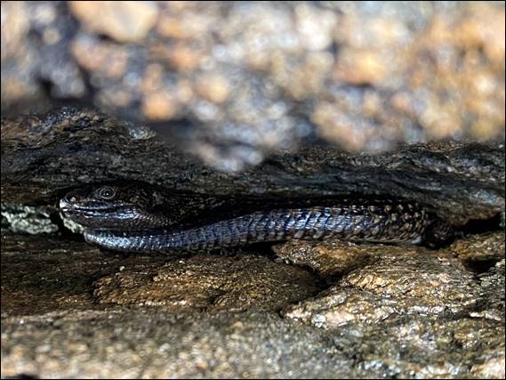 On such a day the last thing I would have expected to see was any reptiles, but we stumbled across two Marbled Gecko (Christinus marmoratus). On the first route David managed to dislodge a rock and exposed one, which after the shock of being exposed so suddenly slowly slunk away into a crevice. Having missed out on seeing it I hunted all over and spotted one buried deep in a crack, too deep to get an image. The two we saw were both dark, dulling the effects of their marbled patterning, and Howsie hinted this was due to the temperature: