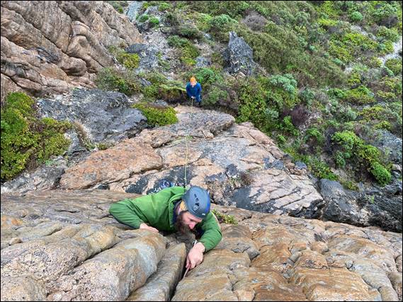 The fact that is was damp was not lost on us. And during on our journey in we discussed where would be best to head. Our choices including thinking about finding some good lower grade lines, to continue to build David’s leading confidence. While the ground was wet, the fresh onshore winds had, as expected, dried the rock faces. We had pondered on Driftwood Bay or the Organ Pipes. I was keen on the latter to enable us to also test Howsie’s metal on a few of the spicier lines, but let them walk ahead and choose for themselves: