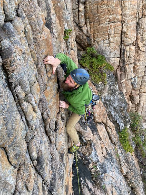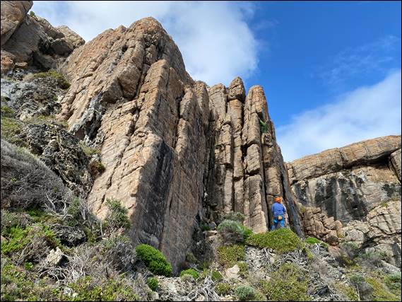 As Howsie continued to climb I ran round snapping images, and also looking for more creatures. Being rewarded by a second surprising find of two King’s Skink (Egernia kingii), which were more accessible for my camera as shown above. You may have guessed that David’s desire to lead had been washed away by the rain. I too was quite happy running round with the camera. At times I feel David was torn between keeping an eye on Howsie leading, and me scrambling round like a mountain goat in at times precarious positions: