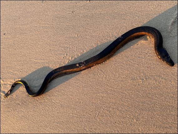 As the day was coming to a close, someone on Lisa’s Peppy Plungers Group posted about a snake on the beach, so I went to investigate. Finding a Yellow-bellied Sea Snake (Hydrophis platurus). The most abundant and wide spread of sea snakes, but I have yet to see one when snorkelling. They live their entire life in the water, but sometimes get beached like this one. As the rely on the support of the water to maintain an even blood pressure, when they are beached they are unlikely to survive. Being highly venomous it is dangerous to handle them, plus with only the slightest bit of life left it was too far gone. So I let nature take its course: