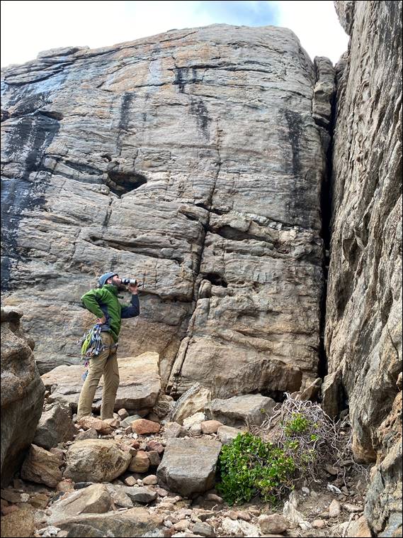 Wandering back down, Craig had already decided on the path out for our final climb. There was not a hint of rain in any direction, with only whispery clouds on the horizon. The forecast had been way off; in our favour this time. Allowing Craig to lead us out with the sun on our backs. Still being fully rugged up, as while the clouds and rain had gone the wind had not eased up. We had, and were still, being buffeted by gale to strong gale force winds. Howsie came up last taking his time and having a good long look behind the flakes and in the cracks: