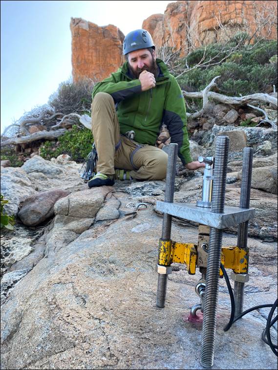 Not climbers, but staff from the state agency that maintains the abseil anchors at the top of the cliff. They had replaced a couple of bolts yesterday and were now testing them. All the bolts along the top of the crag get tested every year, so it is surprising that in nearly two decades of climbing here this was the first time any of us had bumped into them. We found out that they only test the glue strength, which is done by applying a vertical load of 8kN for a period of three minutes. It is simply assumed that the horizontal strength of the bolts is maintained: