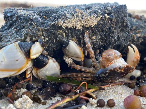 Going back in time, I went down the beach with Lisa and the poodles this morning. It’s rare to spot a crab on our beach in the daytime, but she had done just that a few days back. The chances of a second sighting was slim, but we did see a bunch of By-the-wind Sailors (Velella velella) and Blue Bottles (Physalia physalis), which had been left high and dry. These get washed up during winter on our beaches, and in summer over on the east coast of Australia. And like our Western Stingers that arrive in our summer, they can deliver an unpleasant sting: