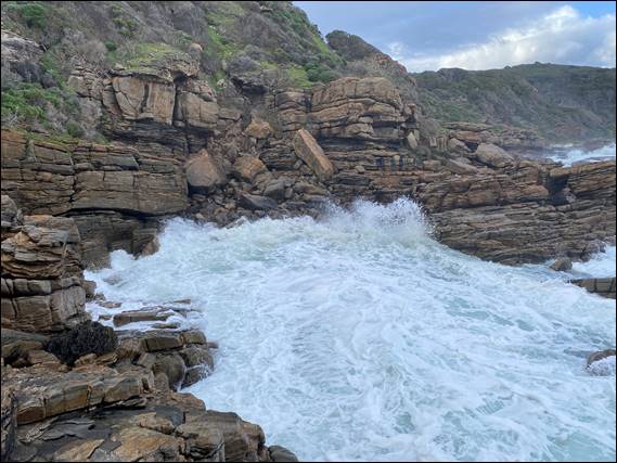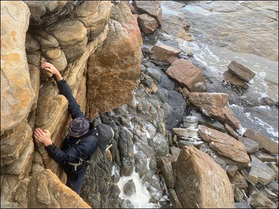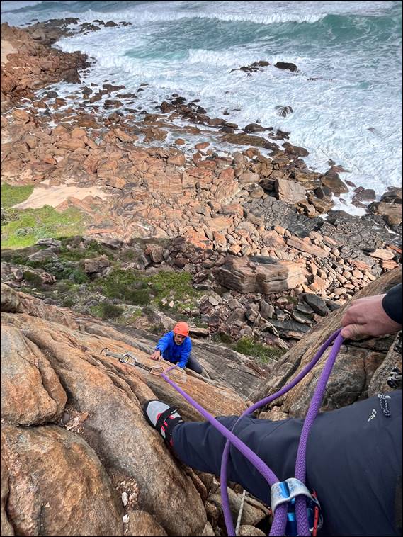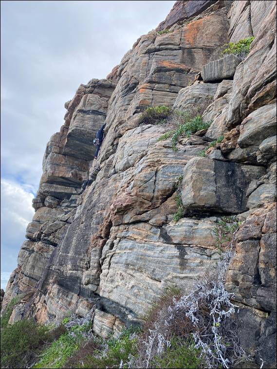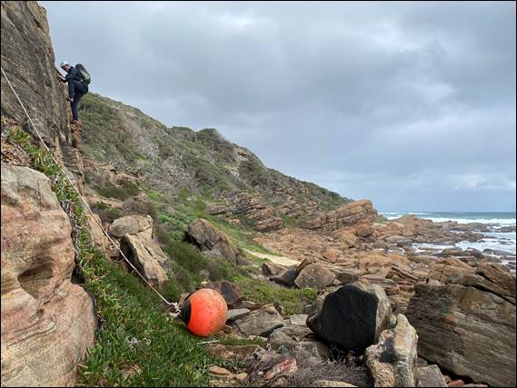 This erosion does have a bearing on why I don’t like driving in, and prefer the walk along the coast. But the walk in along the coast had felt a little too dicey at times today. As such when Craig suggested we could make our way up to the Cape to Cape track to walk out, I felt that would be OK as long as we followed the more solid and rocky ridgeline to get to it. This started with a scramble up the crag but before we could do that Craig went to pick up a bit of flotsam he intended to take home. The buoy was tied to the rap line, so we could haul it up: