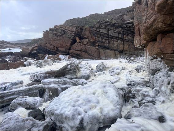 Third time lucky and Craig was feeling well, so we wandered out to Lost Buttress. Of all our local crags this one has the longest approach. At least it is the way I head there, along the coastline. I was possibly a little optimistic today, but Craig went along with it. The swell was at five meters, it was high tide, and fresh to strong winds were aimed at the coast. Bays such as the one above, which we normally rock hop across, were awash. And others, like below, were coated in foam, resulting in the boulders being incredibly dangerous to step on: