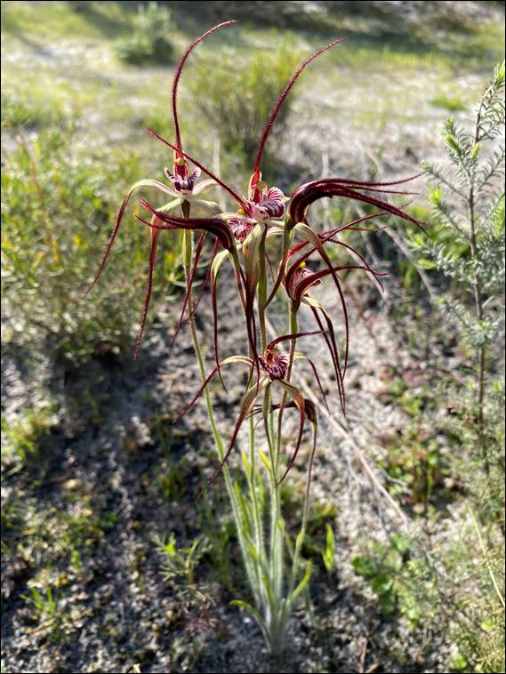 By which I mean ‘fear of missing orchids’. But for now back to the Capel Nature Reserve, where I spotted a different species of white spider. The red labellum and neater fringes making it stand out amongst the countless Sandplain White Spider Orchids. I’ve checked and double checked based on its features, the soil type (deep sands), and vegetation complex (Banksia) in which I found it. The only option is a Giant Spider Orchid (Caladenia excelsa), but is outside of its normal range. If I’m right it is an uncommon find, being listed as endangered: