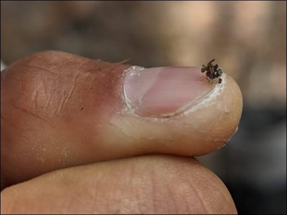 They also walk backwards to make the back look like the head, and then when the situation requires they can hop away quite some distance. Sarah also spied this tiny arachnid, which I have, not surprisingly, had absolutely no luck in identifying. It is likely to be a juvenile, being a mere millimetre or two in size. What really intrigued us was the cluster of soil and leaf detritus attached to its back. Again I can only assume this may have been a camouflage technique, but I can only find out about a spider in Mexico that is known to use this method of concealment: