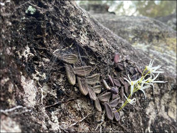And he was right. Another lithophyte orchid, this one being the Tongue Orchid (Dockrillia linguiformis). This species is found in New South Wales and Queensland and is also known to be an epiphyte orchid and can be found growing on both rocks and trees. The Latin words lingua and forma meaning tongue and shape, referring to the leaves as opposed to the flower. And now that we had spotted this one, we spied quite a few more of them scattered round this particular rock outcrop. This was the last species we managed to find in flower: