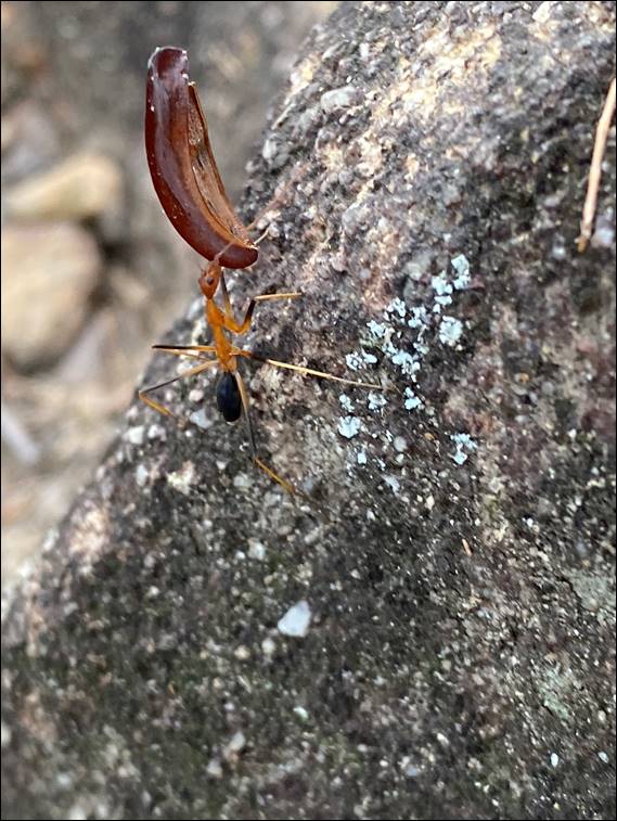 But before I attempt to detail the doozy routes, I have to introduce the Red Spider Ant (Leptomyrmex rufipes). Of all the Leptomyrmex species this one has the widest range, from the base of the Cape York Peninsula to the southern border of Queensland. What caught our attention about this particular ant was the away the abdomen would be pointed upwards when we got to close. They were also fast moving, their speed aided by the long legs, and never seemed to sit still. It took a lot of images to get one that was clear enough to include: