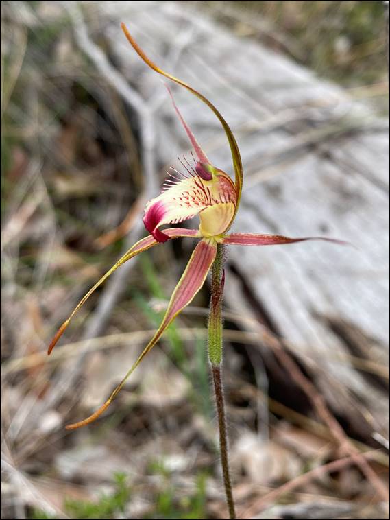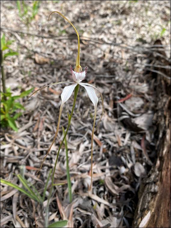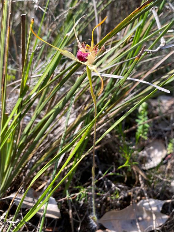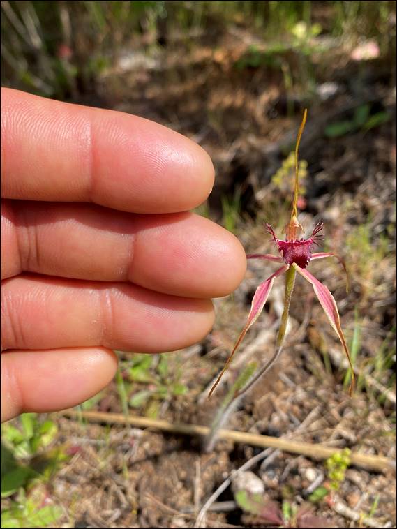 This time, as the name suggests, this spider orchid is only found locally between Yallingup and Busselton in the Jarrah Forest biogeographic region. While not in the best of conditions it was an exciting find being classified as critically endangered by the Western Australian Government, and listed nationally as endangered under the Environment Protection and Biodiversity Conservation Act 1999. You may assume right that this was a fist time find for me, as was the below Broad-Lipped Spider Orchid (Caladenia applanata) making for two lucky last finds: