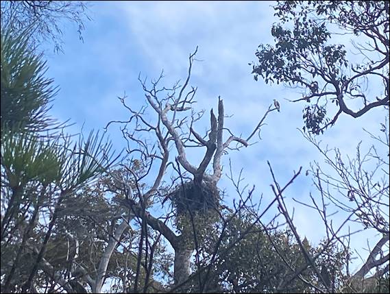 With the intention to get a few miles under our belt, the pace was a little quicker than my orchid walks. Reducing my ability to stop and look about. Certainly on the walk northwards there seemed very little to see, with only a few specimens of species previously sighted this season. Having tempered my expectations I was prepared for the faster pace, and likely low species count. Three images up we did however get to watch a White-bellied Sea-Eagle (Haliaeetus leucogaster), perched above its huge nest of tangled twigs and branches: