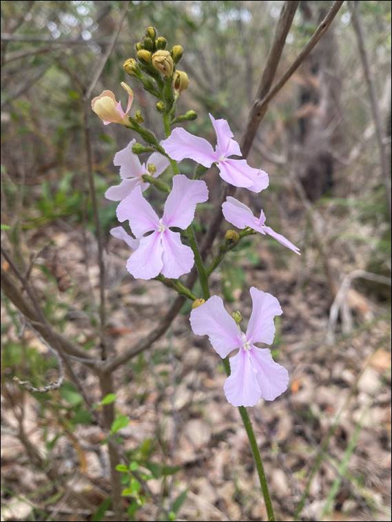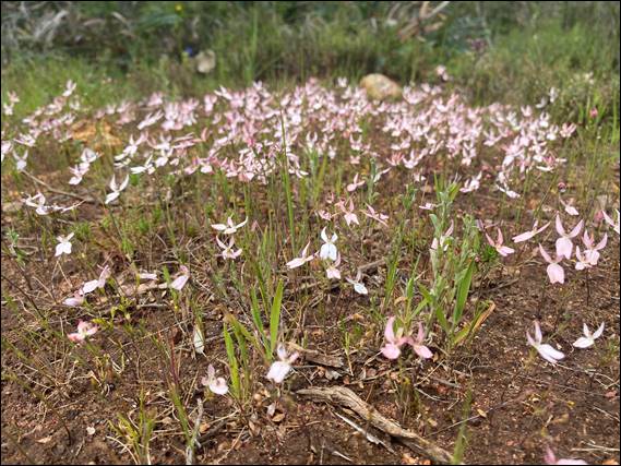 After only scant repeat finds over five to six kilometres, we bumped into Lisa’s fellow Peppy Plungers Linda and Jenny. We were a kilometre or two from Eagle Bay, and they were on their return trip. As we chatted they said quite a few orchids were in the last stretch, raising my hopes. They also referred to a pale pink donkey orchid like looking flower. The latter was in fact the Queen Triggerplant (Stylidium affine). The flowers being several centimetres long, much bigger than the ground cover trigger plants, both shown several images up: