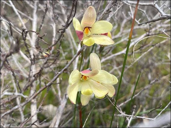 They were however not wrong about the orchids, and as we closed in on Eagle Bay several clumps of Dunsborough Donkey Orchid (Diuris jonesii) appeared. These have relative large flowers, for donkey orchids, being in some instances two inches long. And with the more colourful petals and sepals they are a very pretty sight. Endemic to the south-west of Western Australia, they are not confined to Dunsborough and can be found all along the Leeuwin-Naturaliste National Park and along the Great Southern coast as far east as Albany:
