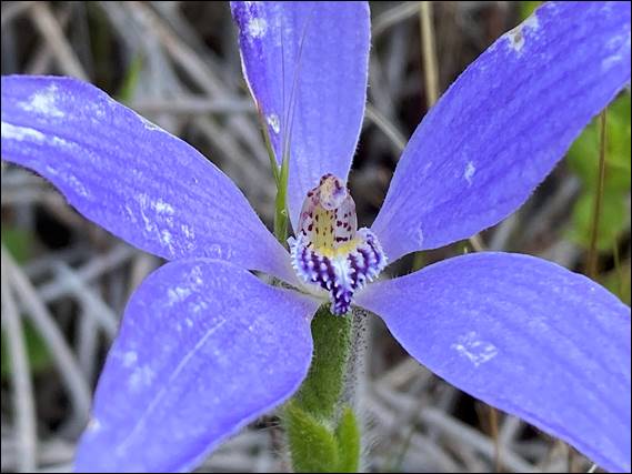 On the return walk, the pace was kept up although we did take five when we diverted on the Meelup Beach lookout loop. Waiting for a whale to spout, tail or flipper splash, or if we were lucky a fully beach. Lisa thought she saw a few whales break the surface, but it was too far off to be sure. After staring out to sea for a while we continued, down the steps and back to the coastline walk. And here the finds continued, with the above Hills White Spider Orchid (Caladenia longicauda subsp. Clivicola) and below Blue China Orchid (Cyanicula gemmate):