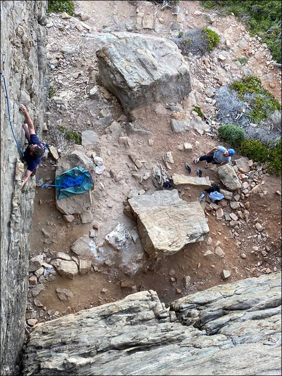 Um maybe I should have got Harry to check my harness. Looking at the other gear loops, I feel it is time for me to retire it before they too fail sending more gear flying. During our ascent another pair of climbers turned up. Curious, I popped my head over the top and saw none other the Peter. Leaving it a little late to start, but enjoying the shade while he could. We moved over to one more route that no longer had shade. The obvious low grade classic, to see if I would be lucky and see the non-venomous scaly friend I usually see here: