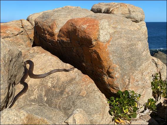 While doing so I narrowly missed stepping on a scaly friend on the path. It slithered into a five meter wide patch of scrub, so I careful looked about. As luck would have it out it popped out on the other side onto the rocks. A Dugite (Pseudonaja affinis subsp. affinis) can grow up to two meters, but generally only reach one and half. This one was a full grown adult and could transfer highly toxic venom in its bite. Accounting for approx. 70% of snake bites reported to Perth Hospital, needless to say I kept my distance and diligently observed its behaviour: