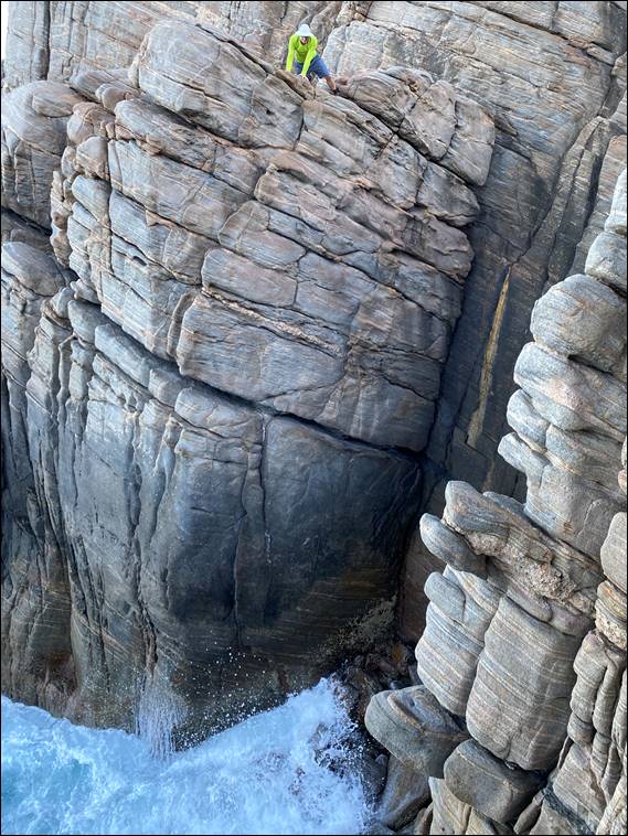 The big attraction being so close the ocean, which provides a great atmosphere. Today the swell was doing a good job of putting on a show for us. So much that any idea of heading into the Zawn was quickly put to bed. Instead we played on the centrepiece of Moses Rocks, Hands Up Wall with its longer lines. While short in nature this place makes up for that, in my opinion, in style. The fine textured gneiss has striking bands of feldspar and quartz alternating with darker bands made of other types of mineral layers: