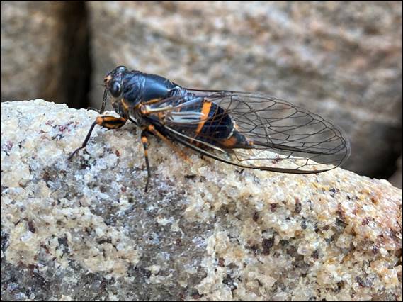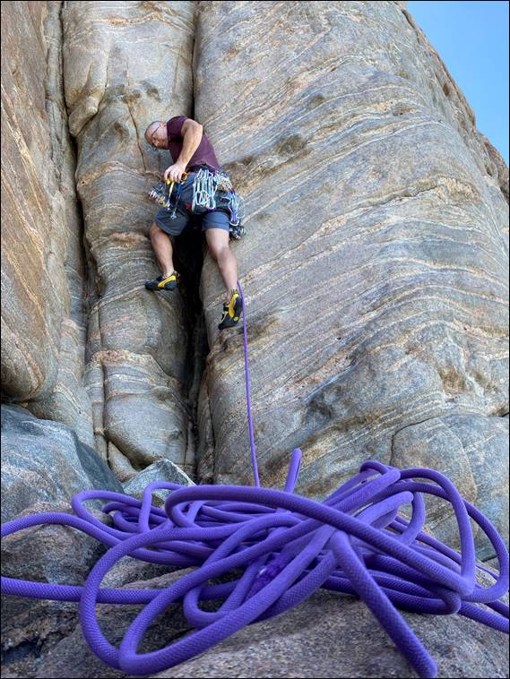 The last route of the morning was the one Adrian found the trickiest. While it wasn’t the highest graded route of the morning, this one was trad and had a flared crack. Working his way up he placed three solid pieces. Above he could only reach a placement he wasn’t happy with. But before he could adjust it, he slipped. The last piece came out of the crack with him, releasing additional rope. Coming down his leg caught behind the rope. Leaving him with mark on the back of his leg, one that matched the fiery band of the Red Bandit Cicadas: