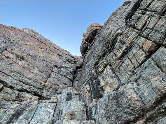 Not overly surprising. In my usual fashion we kept moving. Plus having taken all the leads, his morning was physically and mentally more challenging than mine. But before we were done he was keen to sample one more line on Steel Wall, just not keen to push the grade. As such I offered to take a lead allowing us to access the big ledge half way up, from there he took on a mighty fine face climb that took us to the top. And just as the day had started a rope was thrown into the air. This time it was someone else, setting up a top rope: