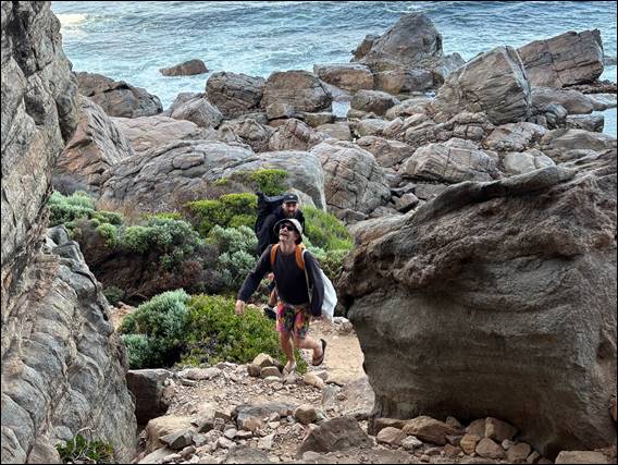 The morning was coming to a close. Howise was however still fired up after working his project, so was keen to squeeze one more climb in. Too tired to climb with packs, Ben kindly offered to be a Sherpa and carried their bags up. Seb would no doubt have also been keen for another route on the sharp end, but I snuck in to get a lead in. Picking a route I wasn’t comfortable climbing with a pack on my back, meaning we had to head back down to get our gear. Instead of walking back down we opted for a fun scramble down and back up, while the others started to sort the gear out: