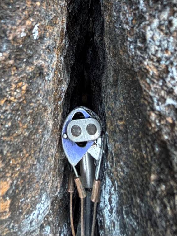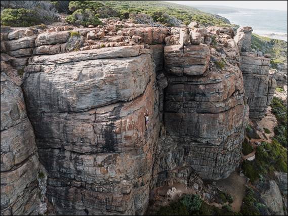 Completely missing the Southwestern Crevice-Skink (Egernia napoleonis) that was tucked behind the cam placement in the fourth image. We wandered along the crag after his successful battle to find Howsie high on Steel Wall, nearing the top of another trad crack. This one being sparse on gear, so while not physical feisty it is mentally demanding. Ben had his drone out, while taking images with his SLR from the safety of the ground. Watching as they rapped back down, so Mikie could ascend a fingery bolted line to complete their warm up: