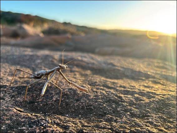 As such I’m keen to jump on it again when the air is drier. The conditions today dictated what we did, and as the day wore on the grades of the lines we did dropped. No matter as we really are both petrophila. The routes were great fun and the positions were epic. The extra damp air did however draw out a few more insects, being attracted by the moisture. In the first image, and as we walked in, we came across a Mallee Grass Mantis (Archimantis sobrina). It watched us carefully, as it stood its ground while swaying gently back and forth: