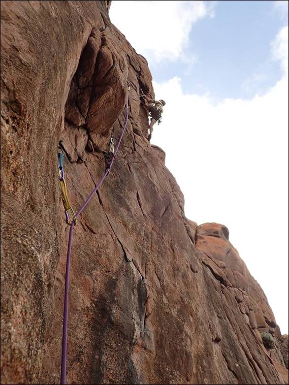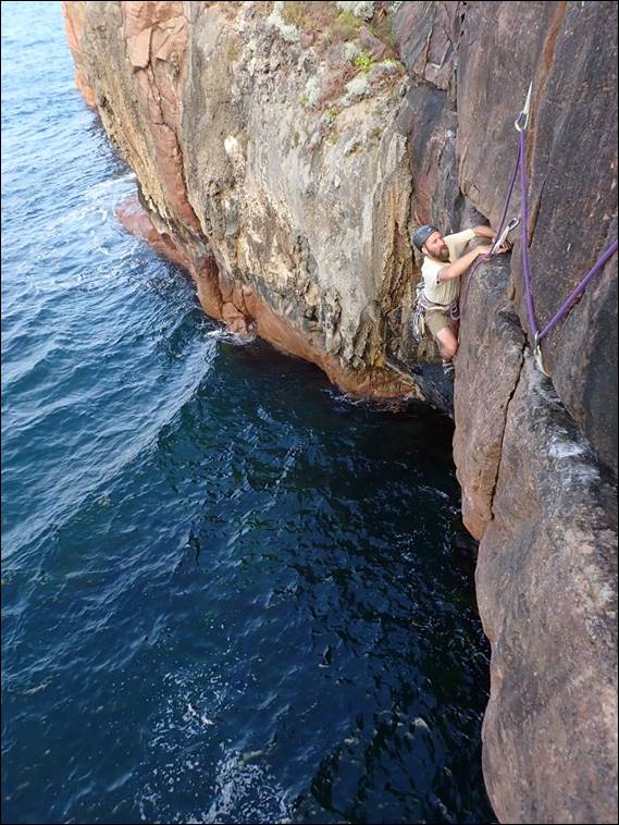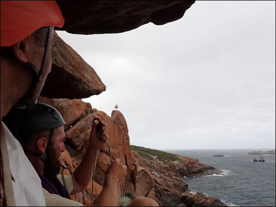 As we walked to the first route we spied a pair of Rock Parrots (Neophema petrophila), two images up. These birds favour rocky islands and coastal dune areas, and unlike other grass parrots they nest in burrows or rocky crevices mostly on offshore islands. The name petrophila comes from two Ancient Greek words of petros and philos meaning ‘rock’ and ‘loving’. It would be a good name for Howsie and I. Despite the mugginess, we were stoked to be out climbing once more. And it is a good job, as the first climb proved to be very challenging in the conditions: