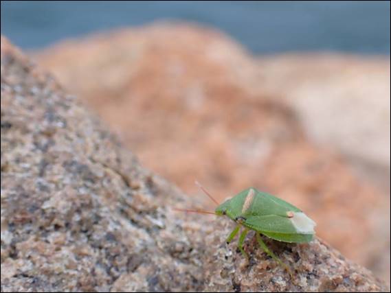 The next bug is an Orange-spotted Ladybird (Orcus australasiae). Distinguished by what looks black, but is in fact a dark green wing covers with six orange dots. The cover acts like a helmet, should predators come along such as ants. Pulling its legs and antenna under the protective cover, and dropping its body to the ground. The final insect being a Shield Bug (Ocirrhoe unimaculata), these are also known as Stink Bugs. This name is given to them due to the unpleasant odour they can emit from glands in their abdomen should they feel threatened: