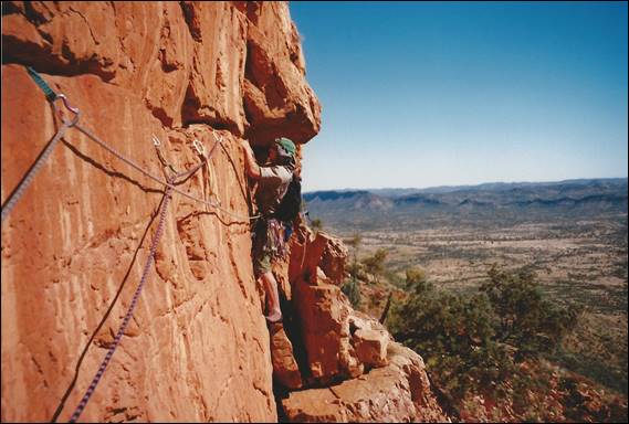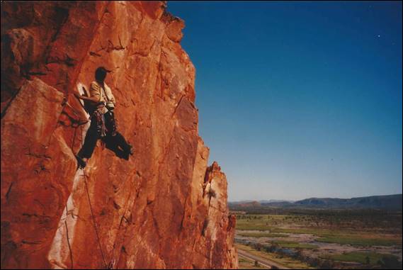 Listed in chronological order, the first nine are in the Red Centre. For more background and images on all of these check Part 11 – Alice Springs – rock, rock and more rock! Dan Ewald was one of a few that took advantage or my unwavering enthusiasm. This route is special being the longest route in the centre, other than an obscure line on the remote Mt Zeil. Unbeknown to us we were not first, finding an aging piton. Despite that it still warrants inclusion, with three divine pitches of equal grade and length. So good I took Lisa up it soon after, and here she is perched on the second belay: