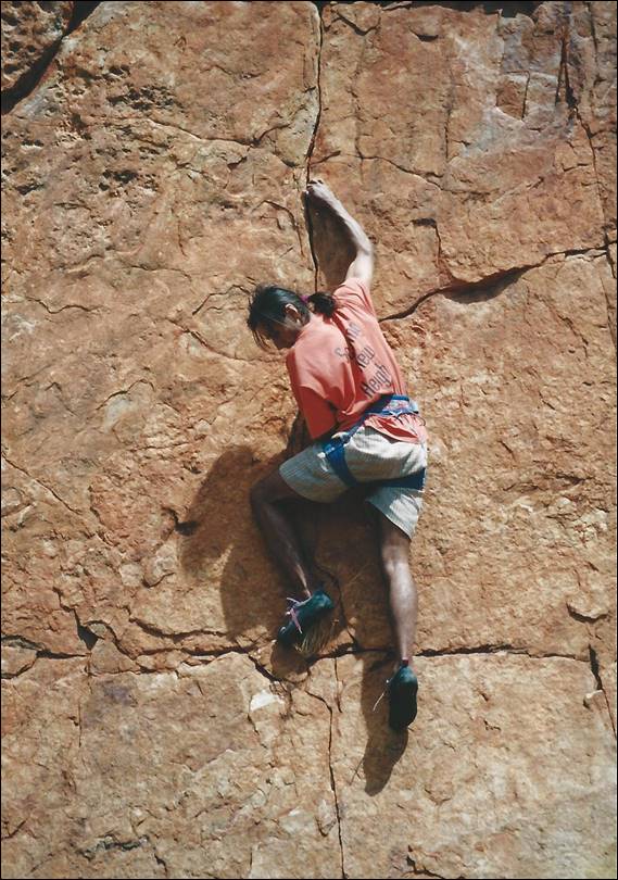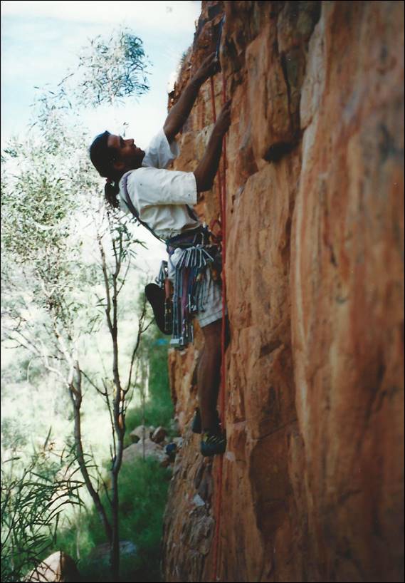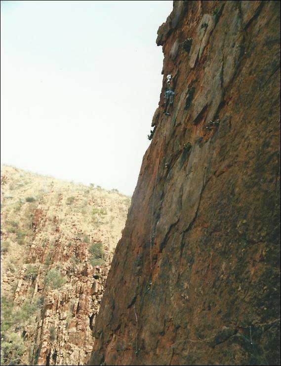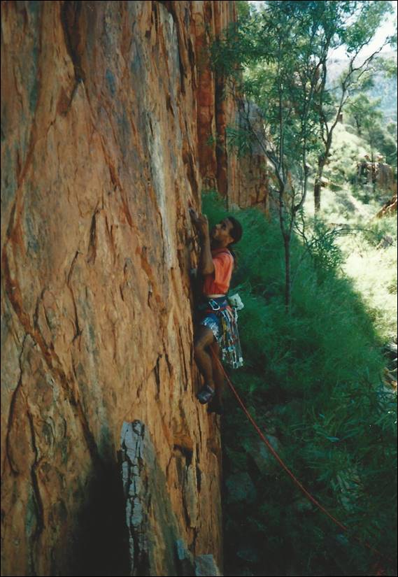 So became my first ever first ascent. The Freezer, which I think was 15-20m tall and we gave it HVS 5b (Aus 18/9). Done with the ethics that had been etched into my very soul, ground up. It was the only first ascent I did in England. And not until I moved to Alice Springs in 2000, did I started to bag more first ascents. A playground with more rock and opportunities that you can poke a stick at. Other than the harder routes we established on Left Wall, where I even placed a couple of hand drilled bolts, all my new routes were established ground up: