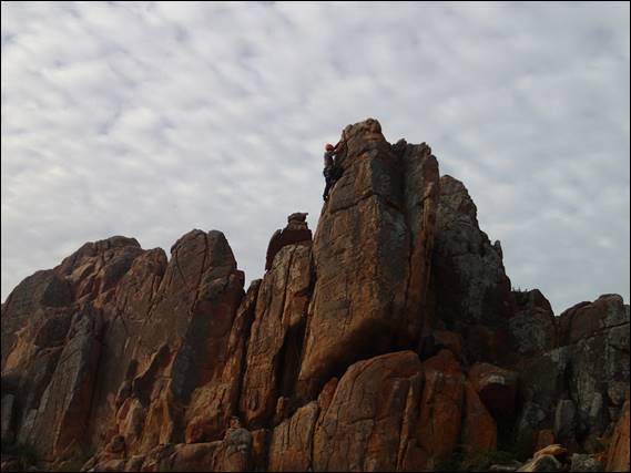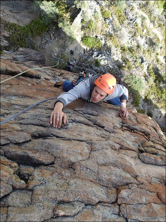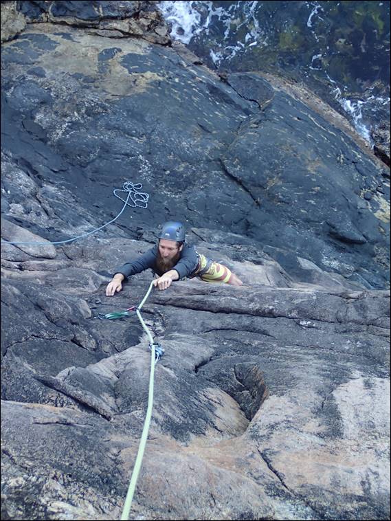 I would have plumped for the Traditionalist 20m 19 (UK E1/2 5b), but Kym felt the rock was too suspect and wanted to top rope the line first, so it wasn’t on sight. But before bagging that route, I jumped on another potential line. Up steep to slightly overhung twin cracks on a boulder, above a wave washed platform. From below Kym and I thought it may be grade 17, but looks can be deceiving. It turned into one of the best climbs I’ve done in terms of having to focus on body position for each and every move. Only just managing to deal with the pump, before topping out: