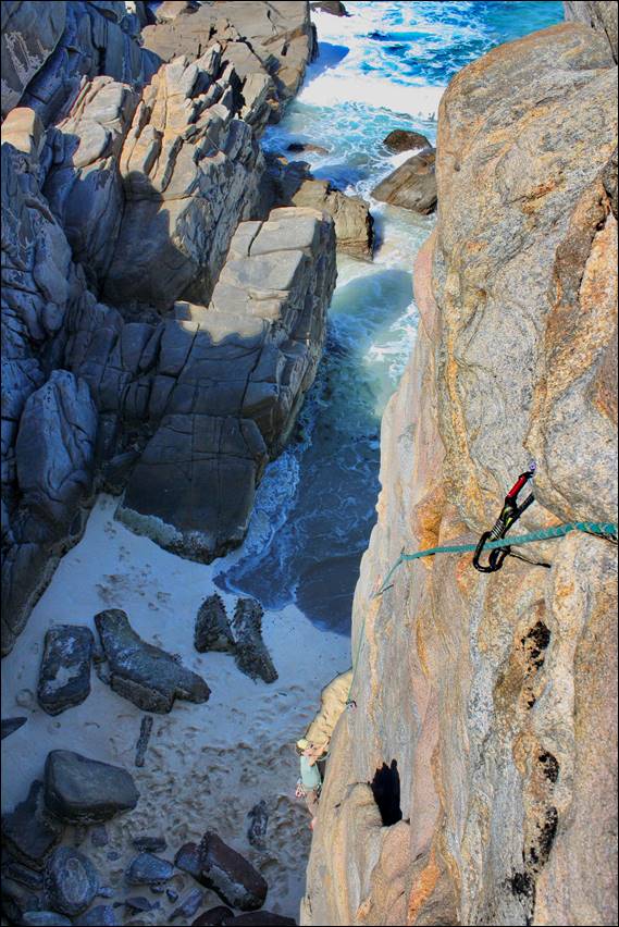 I’ve been lucky to have established a few new areas in the South West. Smith Beach is my favourite. I love every route here even though some scare me, more so with age. It is the place that tested my resolve to maintain an on sight ground up first ascent ethic more than anywhere else. Images I have of Craig Johnson’s facial expressions coming up on second during my ascents, shows the intensity required. Rounded holds, steep lines, flared cracks, and a flaky coastal granite feel. Quite a few people who come here do not return. A traditional style trad climbers place, requiring true grit. This route won out due to its epic position above the ocean: