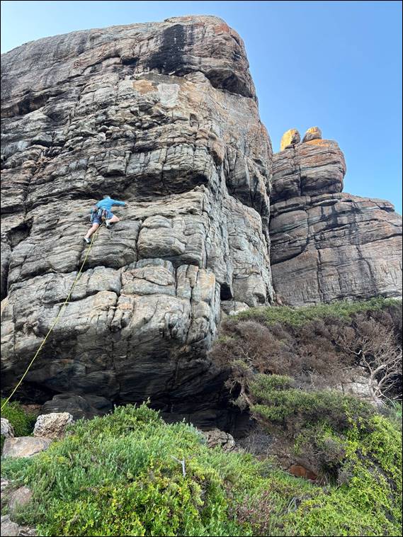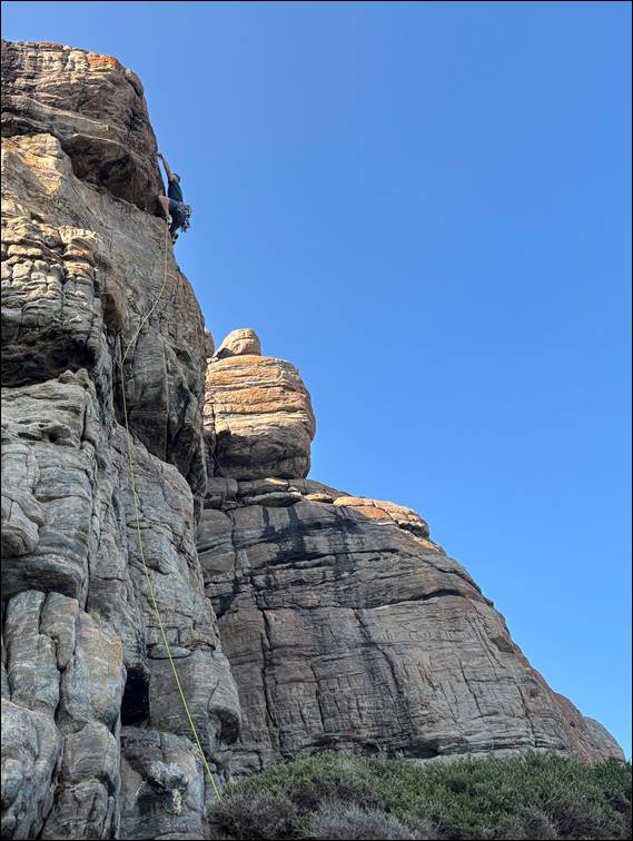 We chatted atop for a while. Allowing us to spy a pod of dolphins and one, or was it two, whales cruise past. It really is a top spot to hang out, and in my slower mood today I enjoyed taking it all in at a reduced pace. Adrian had hinted something around 16 would have been be a good warm up but I had struggled to recall any 16s, despite there being seven at the main crags. Then as we came back down I suggested the best trad route here with bucketful’s of exposure. Misleading him by one grade as it get 17, my mind really was drifting today: