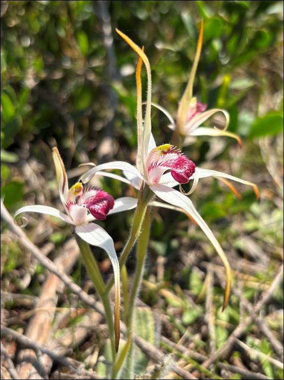 As we wandered down my phone started pinging. Sarah was sending me images of the orchids she had seen, asking what they were. Along with Mario, Rongy, and others at work I’m building up a good group of people giving me hints of where to head for my next orchid hunt. Sarah’s finds helped me make my mind up for the return journey. Deviating off the road home to walk the track leading to Quinninup Falls. Where I was taken by the above Pink Petticoats (Utricularia multifida) and rewarded with loads of Exotic Spider Orchids (Caladenia nivalis):