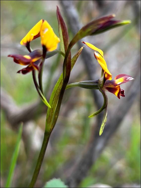 We purposely topped out on our last route, rather than lowering off the anchors to get back down. This allowed us to wander along the top, where there was still plenty of water lying about so late into spring. The narrow strip of granite with its thin veneer of mossy soil amazes me with the variety of orchids we see. Above we came across the Small-flowered Donkey Orchid (Diuris porrifolia), the leaves giving it away. The name porrifolia comes from Latin words porrum and folium meaning ‘a leek’ and ‘leaf’ referring to the shape of the leaves: