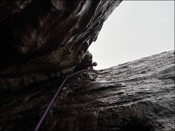 Due to Craig taking the first lead the rock only got wetter. Ignoring this fact, or simply putting it to the back of his mind, Howsie seemed to be happy to give the Christening a go. The reason for the R rating was the image above. A nervous long reach up into the unknown. If you go for it, you are rewarded with a good hold. The sequence in this section has three nervous moves, and with each you get further away from the gear. Slip at the last moment and a 20 foot fall awaits, but it may be a clean fall so the R rating could be unwarranted:
