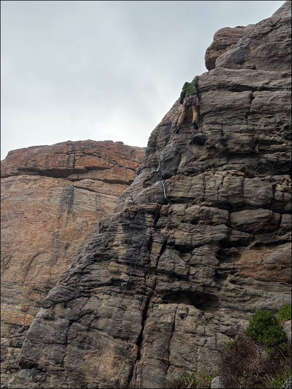 So as Worzel Gummidge sang it was time for ‘a cup o’ tea an’ a slice o’ cake’, both of which went down very well so thank you both. And in response to the question at the start, of why I would be heading out today, the answer should be clear. Being the one day of the year I will not go to work and, if at all possible, rain or shine I will hit rock. We managed three of the more well-trodden climbs, evening bumping up the grade just a wee bit seeing the rock had dried off. As had the gear that we packed away before the next band of rain drifted in: