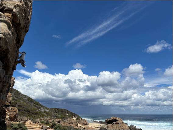 In 2023 we climbed in the blistering heat of the sun with no shade. Today despite the trickery of the morning sky in the first image, as I drove out of Peppy Beach at a far more reasonable hour, I knew we would likely get wet. We picked Craig up on the way down, someone else who is not afraid of being on rock in inclement weather. After that and as we hit the road south the sky ahead became more broody. Wilyabrup was the best place to head, if only for the bigger rooves dotted along the crag to shelter under if it really got too silly: