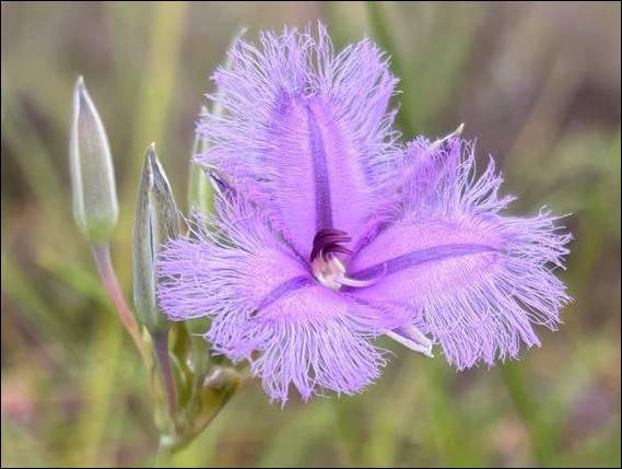 The genus name Dasypogon coming from Greek words dasys and pogon, meaning thick with hair or rough and beard. Used to describe the flower heads, of the three species that are all endemic to Southwest Australia that are similar looking. Next up is a Many-Flowered Fringe (Thysanotus multiflorus), again endemic to the Southwest Australia. There are approx. 50 species are found in Western Australia, nearly all of which being native. This one is most commonly found, hence also known as the Common Fringe Lily but also the Purple Fringe Lily: